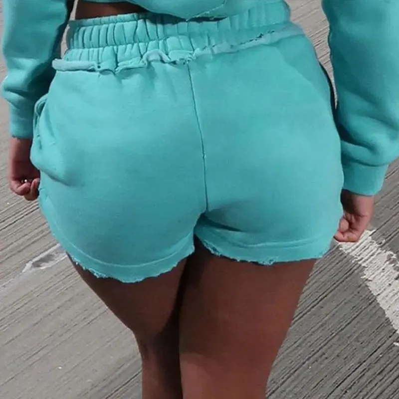 Huili Oem Heavyweight Cotton French Terry Solid Color Zip up Crop Top Jacket Custom logo Two Piece Women Hoodie and Shorts Set